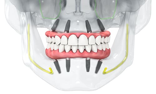 オールオンフォーは、その名の通り**「4本」**のインプラントをあごの骨に埋め込み、その上に12本分の歯が一体となったブリッジを固定します。